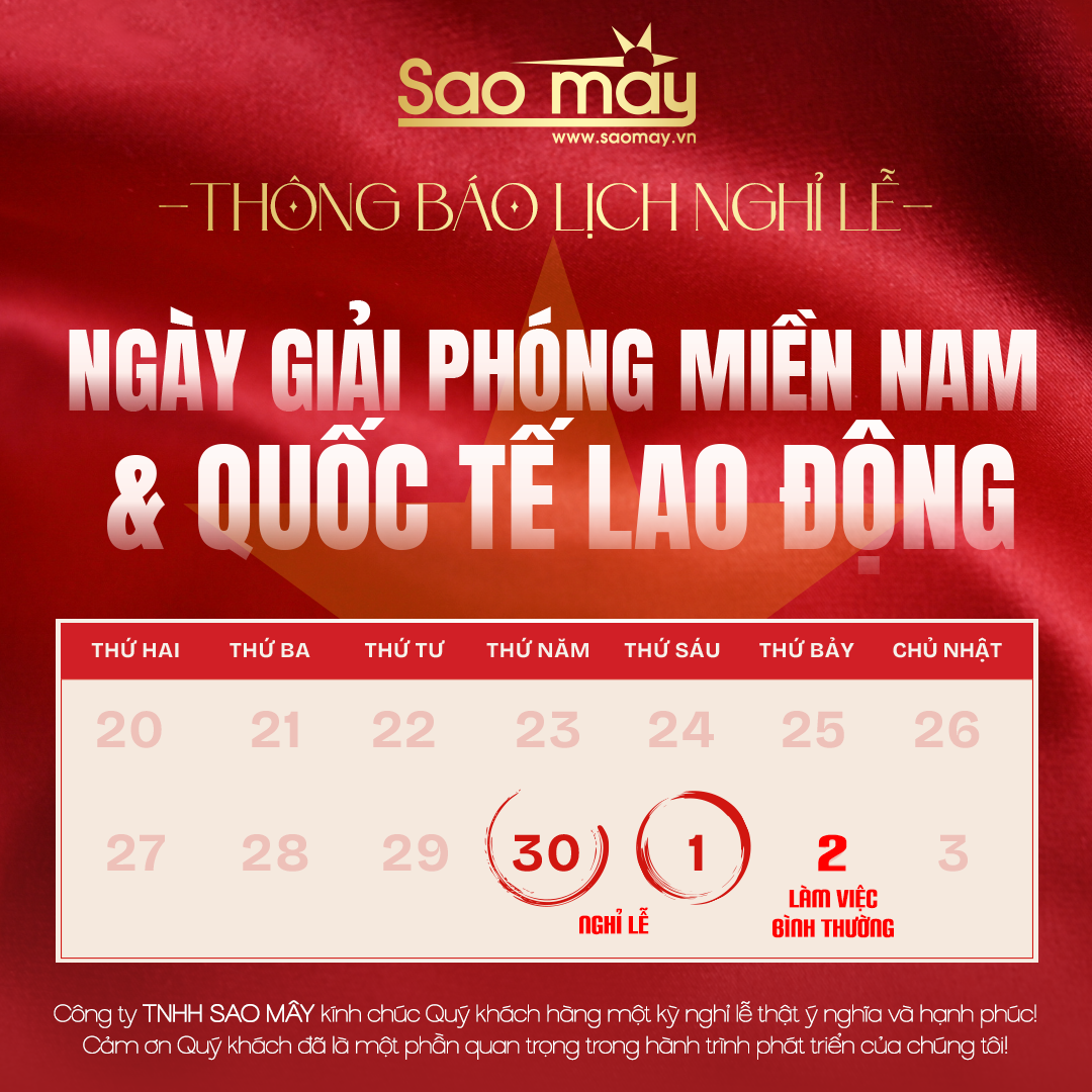 Nhân dịp Ngày Giải phóng miền Nam (30/04) và Quốc tế Lao động (01/05), Công ty TNHH Sao Mây xin trân trọng thông báo đến Quý khách hàng và toàn thể nhân viên lịch nghỉ lễ như sau: